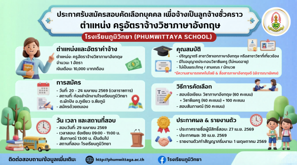 ประกาศรับสมัครสอบคัดเลือกบุคคล เพื่อจ้างเป็นลูกจ้างชั่วคราว ทำหน้าที่ ตำแหน่ง ครูอัตราจ้างวิชาภาษาอังกฤษ 17 เม.ย. 69