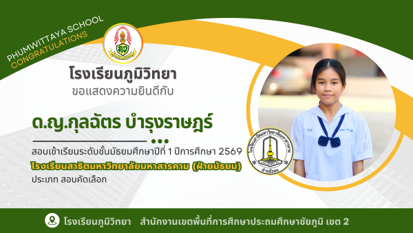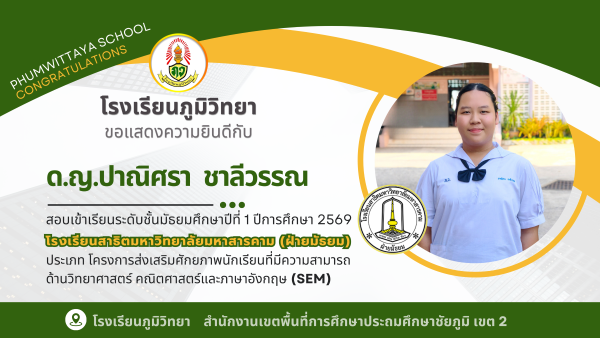 ประกาศผลการทดสอบ โครงการทดสอบศักยภาพทางวิชาการ PHUMWITTAYA TEST ครั้งที่ 6 ประจำปีการศึกษา 2568 19 ก.พ. 69
